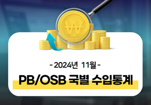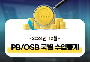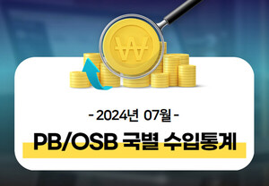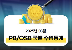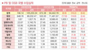 2025년 6월 PB 및 OSB 국별 수입실적PB 및 OSB 국별 수입금액은 태국>중국>말레이시아>인도네시아>베트남 순2025년 6월까지 누적 금액은 94,442천달러. 약 1,341억원.전년 동월 대비 수입금액 7.2% 감소. 물량 7.8% 감소. 단가 0.6% 상승.수입국 중 태국이 금액으로 83.3%를 차지. 물량으로 87.1% 차지.