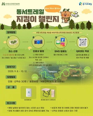 산림청 산하 한국등산·트레킹지원센터(이사장 서경덕)는 오는 9월 8일부터 10월 12일까지 국민 누구나 참여할 수 있는 ‘동서트레일 지킴이 챌린지’를 운영한다.이번 챌린지는 동서트레일 개통을 앞두고 숲길을 널리 알리고, 국민 참여를 이끌기 위해 기획된 사전 홍보 프로그램이다. 참가자는 동서트레일 1~4구간(충남 태안), 47구간(경북 봉화), 55구간(경북 울진)을 걸은 뒤, 인증사진을 본인 SNS에 해시태그와 함께 게시하고 QR코드를 통해 신청서를 제출하면 된다.신청 접수 후 적합 여부 검토를 거쳐 선착순 30명을 선정하며, 선정