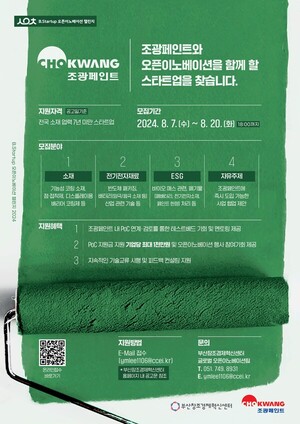 조광페인트(대표이사 양성아)는 부산창조경제혁신센터(센터장 김용우, 이하 부산센터)와 오픈이노베이션(개방형 혁신)을 함께 이끌어 나갈 ‘B.Startup 오픈이노베이션 챌린지 2024’의 참여 스타트업을 오는 20일까지 모집한다고 밝혔다.‘B.Startup 오픈이노베이션 챌린지 2024’는 대·중견기업에 필요한 기술력 및 서비스를 가진 유망 스타트업을 발굴하여 대기업과의 협업, 시장 검증 기회를 제공하며, 향후 사업 제휴 가능성을 이끌어 내기 위한 대표 오픈이노베이션 프로그램으로 올해 5회차를 맞이했다.이번 5기 협업에는 1개 사가
