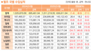 2025년 6월 펄프 국별 수입실적펄프 국별 수입금액은 브라질>캐나다>칠레>우루과이>인도네시아>미국 순2025년 6월까지 누적 금액은 636,611천달러. 약 9,939억원.전년 동월 누계 대비 수입금액 8.5% 감소. 수입물량 1.4% 감소. 단가 7.1% 하락수입국 중 브라질이 금액으로 22.4%를 차지. 물량도 브라질이 23.3% 차지.
