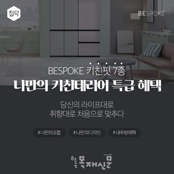 [한국목재신문=강진숙] 인테리어 중개 플랫폼 전문기업 집닥(대표이사 박성민)이 삼성전자와 공동으로 공간 맞춤형 가전제품 비스포크(BESPOKE) 특별 이벤트를 진행한다. 이번 이벤트는 공간 콘셉트에 따라 디자인, 크기, 색상 등을 맞춤 적용할 수 있는 가전 솔루션과 함께 주방 인테리어를 제안하기 위해 마련했다.