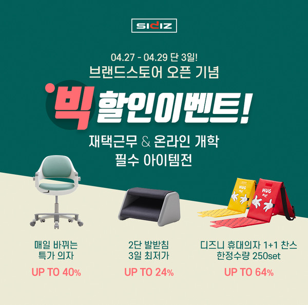 퍼시스그룹의 의자 전문 브랜드 시디즈(대표 이상배)가 자사 네이버 브랜드스토어의 오픈을 기념해 학생용 및 사무용 의자 등 인기품목을 최대 64%까지 할인하는 기획전을 진행한다.