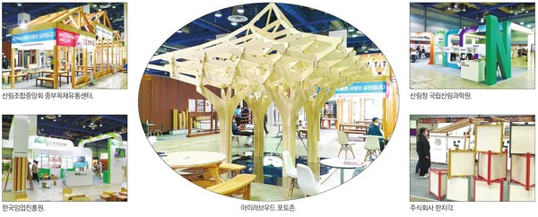 국산재 중목구조 골조를 전시한 산림조합중앙회 중부유통센터와 지붕구조가 공룡의 뼈를 닮은 중목구조 프리컷과 독일기술의 트로칼 시스템창호의 콜라보를 선보인 우딘. GREEN을 형상화한 부스와 연구자료와 연구성과물들을 비치한 산림청 국립산림과학원 부스. 눈으로 수종 맞추 기와 품질표시제도, 각종 시험 및 인증제도를 소개하는 한국임업진흥원 부스. 목재문화활성화의 산실 목재문화진흥회. 한치각을 응용해 조형물과 목재전시부스 아이템을 선보인 주식회사 한치각. 목재세척제, 투명코팅제, 곰팡이제거제, 옻칠스테인을 선보인 동화특수산업. 천연성분으로 만든 오일제품을 선보인 에스알티. CLT 모듈러하우스를 선보인 휴인주식회사.