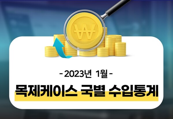 목제케이스 국별 수입금액은 중국>네덜란드>대만>베트남>미국 순이고 2023년 1월까지 누적 금액은 6,385천 달러이다. 전년 동월 대비 수입금액은 11.3% 증가했고 물량은 3.5% 증가, 단가는 7.5% 상승했다. 수입국 중 중국이 금액으로 69.1%를 차지했고 물량으로 59.9% 차지했다.