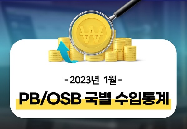 PB 및 OSB 국별 수입금액은 태국>말레이시아>캐나다>루마니아>인도네시아 순이고 2023년 1월까지 누적 금액은 15,189천 달러이다. 전년 동월 대비 수입금액은 44.5% 감소했고 물량은 24.4% 감소, 단가는 26.5% 하락했다. 수입국 중 태국이 금액으로 90.7%를 차지했고 물량으로 94.4% 차지했다.
