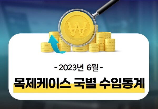 목제케이스 국별 수입금액은 중국>네덜란드>대만>베트남>미국>브라질 순이고 2023년 6월까지 누적 금액은 37,172천 달러. 약 494억 원이다. 전년 동월 누계 대비 수입금액은 14.4% 증가했고 물량은 4.8% 증가, 단가는 9.2% 상승했다. 수입국 중 중국이 금액으로 57.1%를 차지했고 물량으로 45.3% 차지했다.