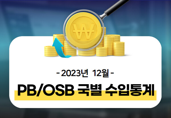 PB 및 OSB 국별 수입금액은 태국>인도네시아>말레이시아>캐나다>루마니아>베트남 순이고 2023년 12월까지 누적 금액은 178,613천 달러. 약 2,352억 원이다. 전년 동월 대비 수입금액은 24.8% 감소했고 물량은 1.5% 증가, 단가는 25.9% 하락했다. 수입국 중 태국이 금액으로 84.3%를 차지했고 물량으로 87.9% 차지했다.