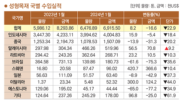 원목의 1월 수입금액은 전년 1월 금액 보다 10.1% 감소했고, 제재목은 20.2% 감소했다. 전년 동월 물량기준으로 보면 원목은 14.5% 증가했고, 제재목은 8.7% 감소했다. 합판의 1월 금액은 전년 동월보다 10.4% 증가했고 물량은 14.4% 증가했다. 단판의 수입물량은 62.2% 증가했다. MDF 수입물량은 65.1% 증가했고 PB와 OSB는 26.7% 증가했다. 칩(펠릿)의 물량은 9.0% 감소했다. 목탄의 수입 물량은 전년 동기 1월 대비 16.4% 증가했다.