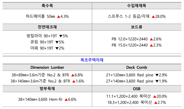 하지만 지금은 다시 안정되고 있다. 구조재와 OSB 등 목조주택자재 가격이 소폭 인상됐다. OSB 11mm가 1월에 비해 20% 인상됐다. 콤브데크재는 2~3% 가격이 하락했다. 방부목도 1.5~6.6% 인상됐다. 2X4 규격재 방부목이 6.6% 인상됐다. 미송합판 12mm가 7.1% 하락했다. 천연데크재 방킬라이 5%, 큐링 5%, 이페 2% 각각 하락했다. 하드메이플 특수목 50mm 판재가 4.3% 인상됐다. 북양재 원목, 남양재 원목, 북양재 제재목, 집성재, 합판류의 가격은 보합세다.