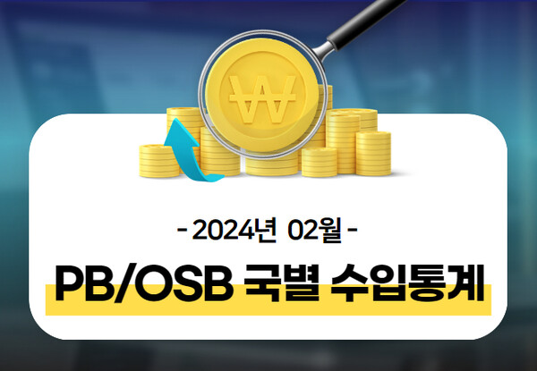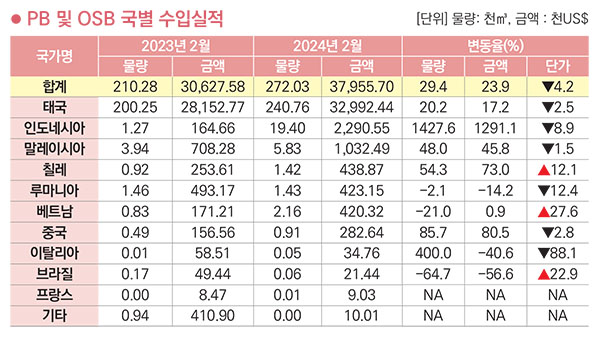 PB 및 OSB 국별 수입금액은 태국>인도네시아>말레이시아>칠레>루마니아>베트남 순이고 2024년 2월까지 누적 금액은 37,955천 달러. 약 504억 원이다. 전년 동월 대비 수입금액은 23.9% 감소했고 물량은 23.9% 증가, 단가는 4.2% 하락했다. 수입국 중 태국이 금액으로 86.9%를 차지했고 물량으로 88.5% 차지했다.