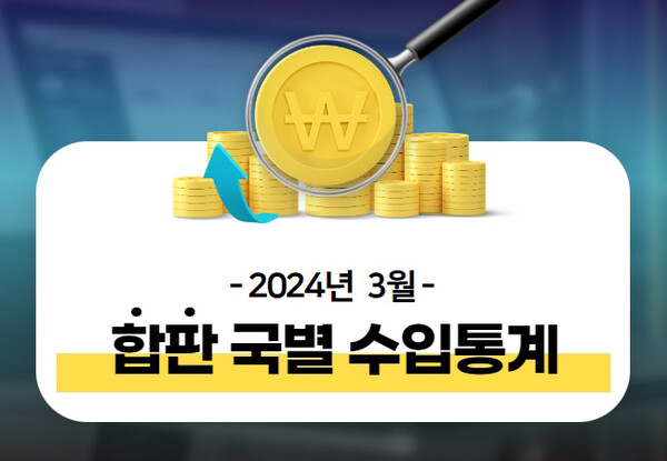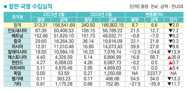 합판 수입금액은 인도네시아>베트남>중국>러시아>말레이시아 순이고 2024년 3월까지 누적 금액은 166,802천 달러. 약 2,193억 원이다. 전년 동월 누계 대비 수입금액은 6.6% 증가했고 물량은 8.7% 증가, 단가는 2.0% 하락했다. 수입국 중 인도네시아가 금액으로 34.0%를 차지했고 물량은 베트남이 44.6% 1위 차지했다.