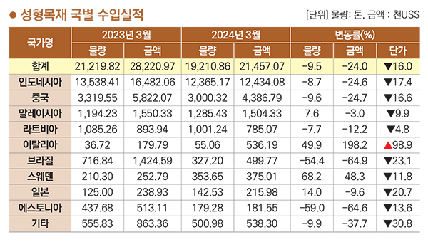 원목의 3월 누계 수입금액은 전년 3월보다 26.1% 감소했고, 제재목은 19.5% 감소했다. 전년 동월 물량기준으로 보면 원목은 19.7% 감소했고, 제재목은 14.8% 감소했다. 합판의 3월 누계금액은 전년 동월보다 6.6% 증가, 물량은 8.7% 증가했다. 단판의 수입물량은 18.8% 감소했다. MDF 수입물량은 2.7% 증가했고 PB와 OSB는 20.7% 증가했다. 칩(펠릿)의 물량은 6.2% 감소했다. 목탄의 수입 물량은 전년 동기 3월 누계 대비 19.9% 감소했다.