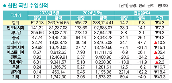합판 수입금액은 인도네시아>베트남>중국>러시아>말레이시아 순이고 2024년 5월까지 누적 금액은 288,124천 달러. 약 3,889억 원이다. 전년 동월 누계 대비 수입금액은 9.3% 증가했고 물량은 14.2% 증가, 단가는 4.3% 하락했다. 수입국 중 인도네시아가 금액으로 32.2%를 차지했고 물량은 베트남이 46.6%로 1위를 차지했다.