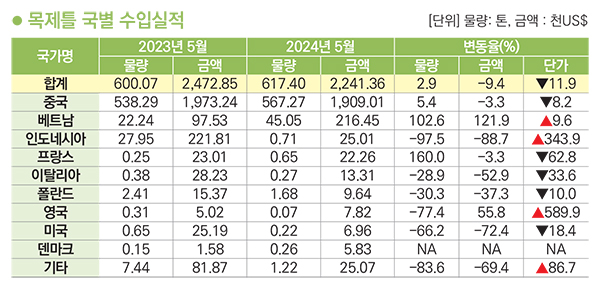 원목의 5월 누계 수입금액은 전년 5월 보다 27.6% 감소했고, 제재목은 11.8% 감소했다. 전년 동월 물량기준으로 보면 원목은 21.0% 감소했고, 제재목은 8.6% 감소했다. 합판의 5월 누계금액은 전년 동월보다 9.3% 증가, 물량은 14.2% 증가했다. 단판의 수입물량은 17.4% 증가했다. MDF 수입물량은 27.8% 증가했고 PB와 OSB는 26.0% 증가했다. 칩(펠릿)의 물량은 2.0% 증가했다. 목탄의 수입 물량은 전년 동기 5월 누계 대비 16.5% 감소했다.