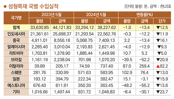 성형목재 국별 수입금액은 인도네시아>중국>말레이시아>라트비아>브라질 순이고 2024년 5월까지 누적 금액은 38,227천 달러. 약 516억 원이다. 전년 동월 누계 대비 수입금액은 13.4% 감소했고 물량은 1.0% 감소, 단가는 12.5% 하락했다. 수입국 중 인도네시아가 금액으로 59.0%를 차지했고 물량으로 64.0% 차지했다.