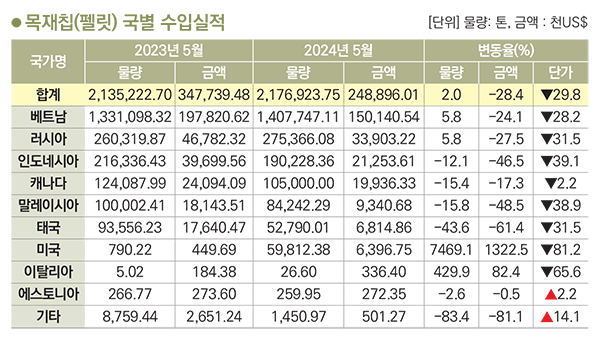원목의 5월 누계 수입금액은 전년 5월 보다 27.6% 감소했고, 제재목은 11.8% 감소했다. 전년 동월 물량기준으로 보면 원목은 21.0% 감소했고, 제재목은 8.6% 감소했다. 합판의 5월 누계금액은 전년 동월보다 9.3% 증가, 물량은 14.2% 증가했다. 단판의 수입물량은 17.4% 증가했다. MDF 수입물량은 27.8% 증가했고 PB와 OSB는 26.0% 증가했다. 칩(펠릿)의 물량은 2.0% 증가했다. 목탄의 수입 물량은 전년 동기 5월 누계 대비 16.5% 감소했다.