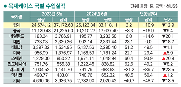 목제케이스 국별 수입금액은 중국>네덜란드>대만>베트남>미국 순이고 2024년 6월까지 누적 금액은 33,118천 달러. 약 447억 원이다. 전년 동월 누계 대비 수입금액은 10.9% 감소했고 물량은 2.2% 감소, 단가는 12.9% 하락했다. 수입국 중 중국이 금액으로 53.3%를 차지했고 물량으로 40.6% 차지했다.