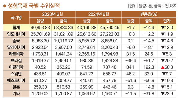 원목의 6월 누계 수입 금액은 전년 6월 누계보다 30.2% 감소했고, 제재목은 10.3% 감소했다. 전년 동월 물량 기준으로 보면 원목은 25.8% 감소했고, 제재목은 8.5% 감소했다. 합판의 6월 누계 금액은 전년 동월보다 5.8% 증가, 물량은 10.7% 증가했다. 단판의 수입 물량은 10.2% 증가했다. MDF 수입 물량은 36.2% 증가했고 PB와 OSB는 22.7% 증가했다. 칩(펠릿)의 물량은 3.1% 증가했다. 목탄의 수입 물량은 전년 동기 6월 누계 대비 15.45% 감소했다.