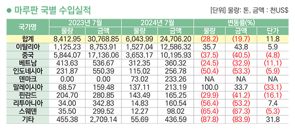 마루판 국별 수입금액은 이탈리아>중국>베트남>인도네시아>덴마크 순이고 2024년 7월까지 누적 금액은 24,706천 달러. 약 333억 원이다. 전년 동월 누계 대비 수입금액은 19.7% 감소했고 물량은 28.2% 감소, 단가는 11.8% 상승했다. 수입국 중 이탈리아가 금액으로 50.9%를 차지했고 물량으로 중국이 60.4% 차지했다.