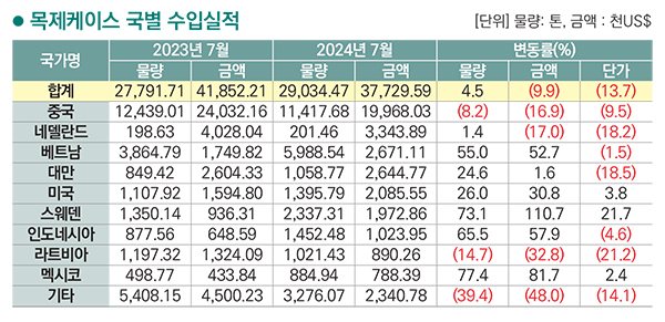 원목의 7월 누계 수입 금액은 전년 7월 누계보다 28.9% 감소했고, 제재목은 6.0% 감소했다. 전년 동월 물량 기준으로 보면 원목은 24.8% 감소했고, 제재목은 4.4% 감소했다. 합판의 7월 누계 금액은 전년 동월보다 5.4% 증가, 물량은 8.8% 증가했다. 단판의 수입 물량은 17.3% 감소했다. MDF 수입 물량은 41.5% 증가했고 PB와 OSB는 22.3% 증가했다. 칩(펠릿)의 물량은 4.8% 증가했다. 목탄의 수입 물량은 전년 동기 6월 누계 대비 13.9% 감소했다.