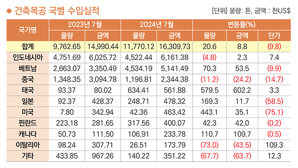 원목의 7월 누계 수입 금액은 전년 7월 누계보다 28.9% 감소했고, 제재목은 6.0% 감소했다. 전년 동월 물량 기준으로 보면 원목은 24.8% 감소했고, 제재목은 4.4% 감소했다. 합판의 7월 누계 금액은 전년 동월보다 5.4% 증가, 물량은 8.8% 증가했다. 단판의 수입 물량은 17.3% 감소했다. MDF 수입 물량은 41.5% 증가했고 PB와 OSB는 22.3% 증가했다. 칩(펠릿)의 물량은 4.8% 증가했다. 목탄의 수입 물량은 전년 동기 6월 누계 대비 13.9% 감소했다.