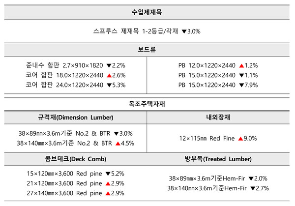 9월 목재가격은 거의 움직이지 않았다. 유의미한 등락 폭을 보이지 않았고 합판과 목조주택자재 그리고 스프루스 각재 가격이 일부 상승과 하락을 했을 뿐이다. 수요의 변화가 읽혀지지 않는 상황이다. 러시아산 스프루스 제재목도 수요 감소로 3.0% 또 내렸다. 집성재 가격은 변함이 없었다. 특수목의 가격도 변함이 없었다. 천연데크재의 가격도 변화가 없었다. 대부분의 목조주택용 자재 중 구조재 2X4가 3% 정도 내렸고 2X6는 4.5% 올랐다. 콤브데크재 15mm는 5.2% 내렸고 21과 27mm는 2.9% 올랐다. 방부목은 1~2.7% 내렸다. 준내수 합판은 2.7mm 4X8 사이즈가 2.2% 내렸고 내수합판의 가격변동은 없었다. 코어합판 24mm가 5.4% 내렸다. 18mm PB의 가격이 7.9% 내렸다. 9월도 더운 날씨가 지속된 가운데 수요부진이 계속되면서 가을철 특수도 사라진 상태다. /윤형운 기자