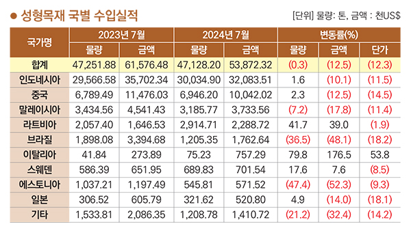 원목의 7월 누계 수입 금액은 전년 7월 누계보다 28.9% 감소했고, 제재목은 6.0% 감소했다. 전년 동월 물량 기준으로 보면 원목은 24.8% 감소했고, 제재목은 4.4% 감소했다. 합판의 7월 누계 금액은 전년 동월보다 5.4% 증가, 물량은 8.8% 증가했다. 단판의 수입 물량은 17.3% 감소했다. MDF 수입 물량은 41.5% 증가했고 PB와 OSB는 22.3% 증가했다. 칩(펠릿)의 물량은 4.8% 증가했다. 목탄의 수입 물량은 전년 동기 6월 누계 대비 13.9% 감소했다.