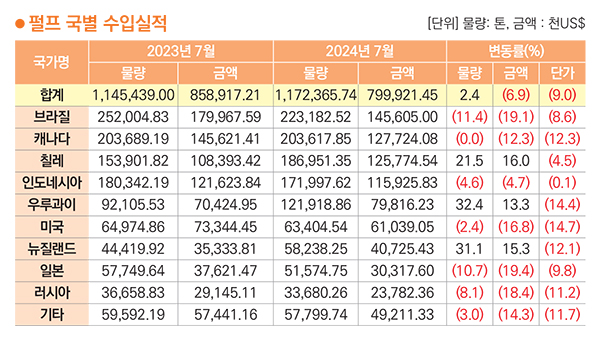 펄프 국별 수입금액은 브라질>캐나다>칠레>인도네시아>우루과이 순이고 2024년 7월까지 누적 금액은 799,921천 달러. 약 1조 798억 원이다. 전년 동월 누계 대비 수입금액은 6.9% 감소했고 수입물량은 2.4% 증가, 단가는 9.0% 하락했다. 수입국 중 브라질이 금액으로 18.2%를 차지했고 물량도 브라질이 19.0% 차지했다.