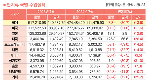 판지류 국별 수입금액은 미국>일본>태국>오스트레일리아>대만 순이고 2024년 7월까지 누적 금액은 92,963천 달러. 약 1,745억 원이다. 전년 동월 대비 수입금액은 20.7% 감소했고 물량은 8.3% 감소, 단가는 13.6% 하락했다. 수입국 중 미국이 금액으로 62.5%를 차지했고 물량으로 58.4% 차지했다.
