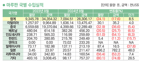 마루판 국별 수입금액은 이탈리아>중국>베트남>인도네시아>핀란드 순이고 2024년 8월까지 누적 금액은 24,706천 달러. 약 333억 원이다. 전년 동월 누계 대비 수입금액은 17.6% 감소했고 물량은 24.1% 감소, 단가는 8.5% 상승했다. 수입국 중 이탈리아가 금액으로 47.6%를 차지했고 물량으로 중국이 62.0% 차지했다.
