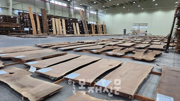 영림목재가 보유한 최고급 우드슬랩이 수천 장이 미가공 상태로 진열돼 있어요. 이 우드슬랩은 완제품이 아닌 상태로도 판매합니다. 완제품으로 제작해달라고 요청하시면 그렇게도 해드립니다. 아코야우드, 중목구조 기둥과 보, 히노끼 판재와 각재, 벽판재, 합판, 구조용 PB, 내장용 각재, 가든용품, 멀바우, 켐파스 등 남양재 데크, 삼나무 집성재, 히노끼 집성재, 원목마루, 강마루, 도어, 몰딩, 벽장식재, 인테리어재, 영림목재가 생산하는 다양한 파렛트, 북미산 특수목 등이 진열돼 있습니다.