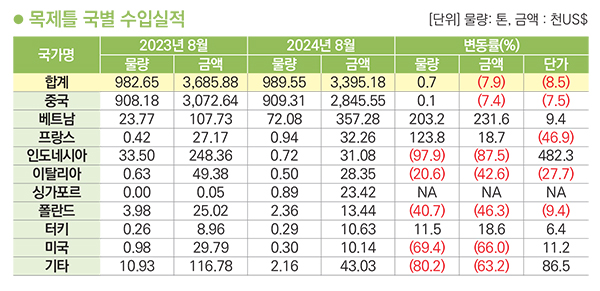 목제틀 국별 수입금액은 중국>베트남>프랑스>인도네시아>이탈리아 순이고 2024년 8월까지 누적 금액은 3,395천 달러. 약 45.8억 원이다. 전년 동월 대비 수입금액은 7.9% 감소했고 수입단가는 8.5% 하락했다. 수입국 중 중국이 금액으로 83.3%를 차지했고 물량으로 91.9% 차지했다.
