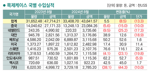 목제케이스 국별 수입금액은 중국>네덜란드>대만>베트남>미국 순이고 2024년 8월까지 누적 금액은 43,641천 달러. 약 589억 원이다. 전년 동월 누계 대비 수입금액은 8.5% 감소했고 물량은 5.5% 증가, 단가는 13.3% 하락했다. 수입국 중 중국이 금액으로 52.9%를 차지했고 물량으로 39.7% 차지했다.