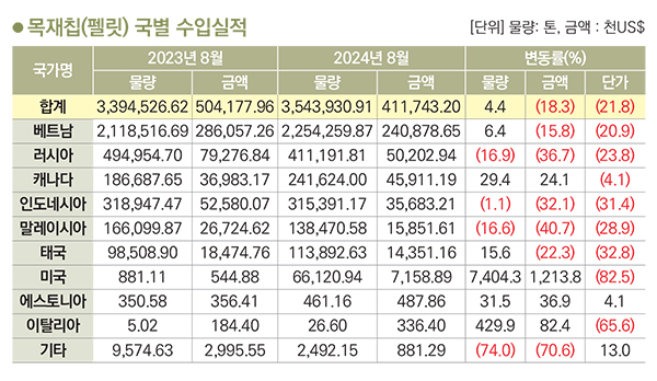 목재칩 국별 수입금액은 베트남>러시아>캐나다>인도네시아>말레이시아 순이고 2024년 8월까지 누적 금액은 411,743천 달러. 약 5,558억 원이다. 전년동월 누계 대비 수입금액은 18.3% 감소했고 물량은 4.4% 증가, 단가는 21.8% 감소했다. 수입국 중 베트남이 금액으로 58.5%를 차지했고 물량으로 63.6% 차지했다.