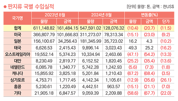 판지류 국별 수입금액은 미국>일본>태국>오스트레일리아>대만 순이고 2024년 8월까지 누적 금액은 128,076천 달러. 약 1,729억 원이다. 전년 동월 대비 수입금액은 20.7% 감소했고 물량은 10.4% 감소, 단가는 11.5% 하락했다. 수입국 중 미국이 금액으로 61.1%를 차지했고 물량으로 56.8% 차지했다.