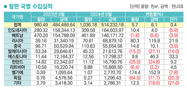 합판 수입금액은 인도네시아>베트남>러시아>중국>말레이시아 순이고 2024년 9월까지 누적 금액은 514,232천 달러. 약 6,941억 원이다. 전년 동월 누계 대비 수입금액은 6.1% 증가했고 물량은 5.7% 증가, 단가는 0.4% 상승했다. 수입국 중 인도네시아가 금액으로 32.0%를 차지했고 물량은 베트남이 44.6%로 1위를 차지했다.