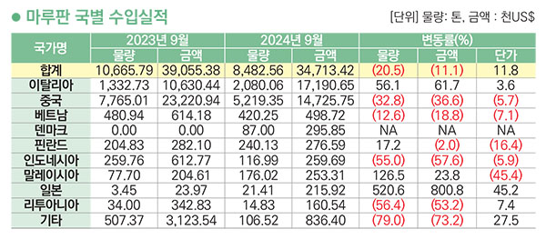마루판 국별 수입금액은 이탈리아>중국>베트남>덴마크>핀란드 순이고 2024년 9월까지 누적 금액은 34,713천 달러. 약 468억 원이다. 전년 동월 누계 대비 수입금액은 11.1% 감소했고 물량은 20.5% 감소, 단가는 11.8% 상승했다. 수입국 중 이탈리아가 금액으로 49.5%를 차지했고 물량으로 중국이 61.5% 차지했다.