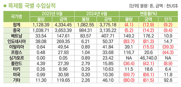 목제틀 국별 수입금액은 중국>베트남>인도네시아>이탈리아>이탈리아 순이고 2024년 9월까지 누적 금액은 3,775천 달러. 약 50.9억 원이다. 전년 동월 대비 수입금액은 12.9% 감소했고 수입단가는 9.2% 하락했다. 수입국 중 중국이 금액으로 83.0%를 차지했고 물량으로 90.9% 차지했다.