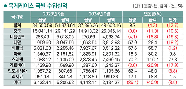 목제케이스 국별 수입금액은 중국>네덜란드>대만>베트남>미국 순이고 2024년 8월까지 누적 금액은 43,641천 달러. 약 589억 원이다. 전년 동월 누계 대비 수입금액은 8.5% 감소했고 물량은 5.5% 증가, 단가는 13.3% 하락했다. 수입국 중 중국이 금액으로 52.9%를 차지했고 물량으로 39.7% 차지했다.