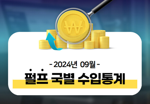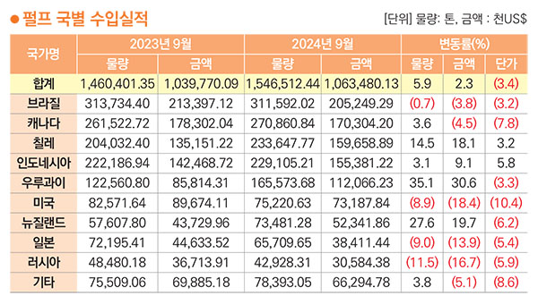 펄프 국별 수입금액은 브라질>캐나다>칠레>인도네시아>우루과이 순이고 2024년 9월까지 누적 금액은 1,063,480천 달러. 약 1조 4,356억 원이다. 전년 동월 누계 대비 수입금액 2.3% 감소했고 수입물량은 5.9% 증가, 단가는 3.4% 하락했다. 수입국 중 브라질이 금액으로 19.3%를 차지했고 물량도 브라질이 20.1% 차지했다.