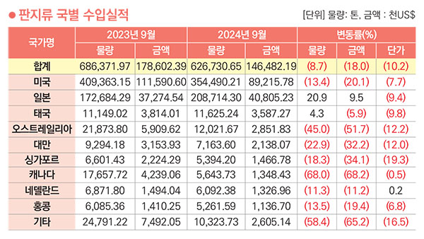 판지류 국별 수입금액은 미국>일본>태국>오스트레일리아>대만 순이고 2024년 9월까지 누적 금액은 146,482천 달러. 약 1,977억 원이다. 전년 동월 대비 수입금액은 18.0% 감소했고 물량은 8.7% 감소, 단가는 10.2% 하락했다. 수입국 중 미국이 금액으로 60.9%를 차지했고 물량으로 56.6% 차지했다.