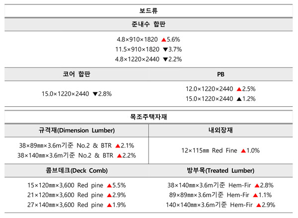 11월 목재가격은 목조주택자재의 소폭 인상과 일부 합판 자재의 일부 인상 및 하락 외에 다른 품목들은 가격 변동이 없었다. 환율인상분이 반영되는 다음 달에는 일부 제재목의 가격 인상이 예상되지만 수요 견인력이 약해 인상될지 아니면 그대로 갈지는 예상하기 어렵다. 건설시장과 내수시장이 모두 최악의 상황이라 목재 자재의 수요의 변화는 기대하기 어려워 환율 인상분을 반영 못 할 경우 업계의 부담은 더욱 늘어날 전망이다. 러시아 스프루스 제재목, 데크재, 집성재, 특수목, 북양재와 남양재 원목 모두 가격 변화가 없었다. 대부분의 목조주택용 자재 중 구조재 2X4가 2.1% 정도 인상됐고 2X6도 2.2% 올랐다. 콤브데크재 15mm 는 5.5% 올랐고 21mm와 27mm는 각각 2.9, 1.9% 올랐다. 방부목은 1.1~2.9% 올랐다. 준내수 합판은 4.8mm 3X8 사이즈가 5.6% 올랐고 4X8 사이즈는 3.7% 내렸다. 코어합판 15mm 4X8은 2.8% 내렸다. 12mm와 15mm PB의 가격이 각각 2.5, 1.2% 올랐다. 11월도 수요부진이 계속되면서 업계의 고민은 높아져 가고 있다. /윤형운 기자