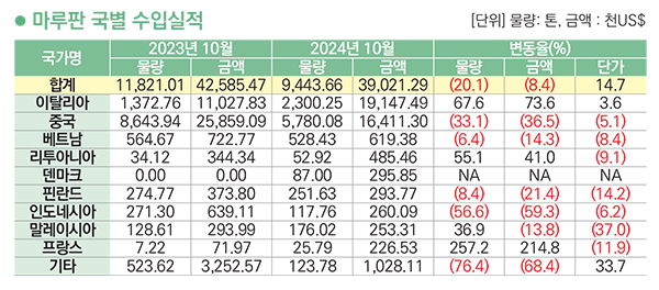 마루판 국별 수입금액은 이탈리아>중국>베트남>리투아니아>덴마크>핀란드 순이고 2024년 10월까지 누적 금액은 39,012천 달러. 약 526억 원이다. 전년 동월 누계 대비 수입금액은 8.4% 감소했고 물량은 20.1% 감소, 단가는 14.7% 상승했다. 수입국 중 이탈리아가 금액으로 49.0%를 차지했고 물량으로 중국이 61.2% 차지했다.