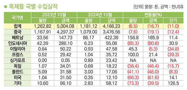 목제틀 국별 수입금액은 중국>베트남>인도네시아>이탈리아>프랑스 순이고 2024년 10월까지 누적 금액은 4,166천 달러. 약 56.2억 원이다. 전년 동월 대비 수입금액은 16.7% 감소했고 수입단가는 11.1% 하락했다. 수입국 중 중국이 금액으로 83.4%를 차지했고 물량으로 91.3% 차지했다.