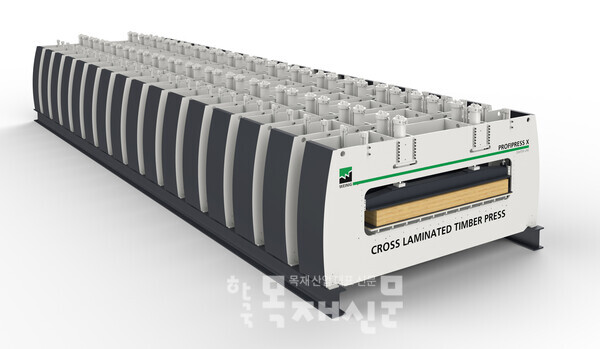 CLT 프레스로 PROFIPRESS X를 제공한다. CLT 길이 방향의 모듈 구조로 고객이 요구하는 최종 CLT 길이에 맞게 조정할 수 있다. 이러한 개별 유니트에는 위에서부터 두 개의 연속적인 유압장치가 있으며 500mm 길이의 스트로크로 프레싱 압력은 독립 제어가 가능하다.