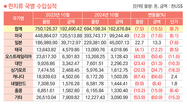 판지류 국별 수입금액은 미국>일본>태국>오스트레일리아>대만 순이고 2024년 10월까지 누적 금액은 162,676천 달러. 약 2,196억 원이다. 전년 동월 대비 수입금액은 15.5% 감소했고 물량은 7.5% 감소, 단가는 8.7% 하락했다. 수입국 중 미국이 금액으로 61.0%를 차지했고 물량으로 56.6% 차지했다.