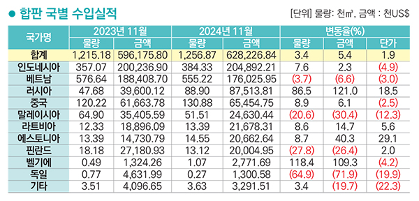 합판 수입금액은 인도네시아>베트남>러시아>중국>말레이시아 순이고 2024년 11월까지 누적 금액은 628,226천 달러, 약 8,732억 원이다. 전년 동월 누계 대비 수입금액은 5.4% 증가했고, 물량은 3.4% 증가, 단가는 1.9% 상승했다. 수입국 중 인도네시아가 금액으로 32.4%를 차지했고, 물량은 베트남이 44.2%로 1위를 차지했다.