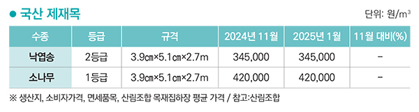 작년 11월에 비해 1월 목재가격은 환율인상이 반영된 품목이 늘어나고 있으며 가격은 3~10% 가량 상승하고 있다. 대부분의 목재자재 가격이 상승하는 중이고 상승이 반영되지 않은 특수목도 2월이면 오를 전망이다. 국산원목의 경우 재작년 3분기에 비해 작년 3분기 가격은 전반적으로 모든 수종에서 하락세를 보였다. 북양 원목과 제재목이 환율의 영향으로 가격이 3~6% 상승 중이다. 천연데크 방킬라이와 멀바우 그리고 이페의 가격이 8~10% 올랐다.
