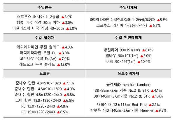 수입 집성재의 가격도 라디에타파인 무절이 3~4% 상승했다. 고무나무 무절이 3.0%, 레드오크 무절이 12.0% 상승했다. 대부분의 목조주택용 자재의 가격은 보합세였으나 구조재 2×4가 1.4~4.1% 정도 인상됐고 내외장재 가 2.1% 올랐다. 방부목은 140×140 사이즈가 9.3% 올랐다. 준내수 합판은 4.8㎜ 3×8 사이즈가 7.1% 올랐고 4X8 사이즈도 5.8% 올랐다. 코어합판 15㎜ 4×8은 6.5% 올랐다. 12㎜와 15㎜ PB의 가격이 각각 4.8, 6.5% 올랐다. 1월도 수요부진이 계속되면서 환율이 계속 치올라 업계의 고민은 깊어져만 가고 있다. /윤형운 기자