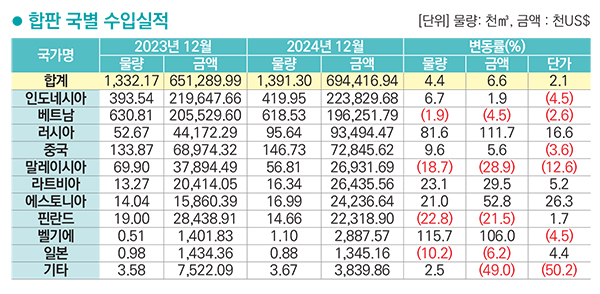 합판 수입금액은 인도네시아>베트남>러시아>중국>말레이시아 순이고 2024년 12월까지 누적 금액은 694,416천 달러. 약 9,374억 원이다. 전년 동월 누계 대비 수입금액은 6.6% 증가했고 물량은 4.4% 증가, 단가는 2.1% 상승했다. 수입국 중 인도네시아가 금액으로 32.1%를 차지했고 물량은 베트남이 44.4%로 1위를 차지했다.
